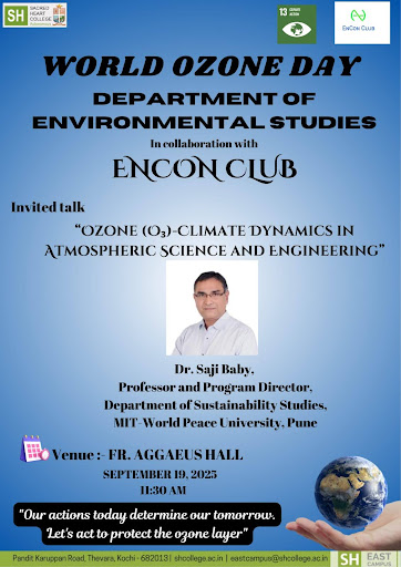The Department of Environmental Studies, in collaboration with the ENCON Club, organized a special event to commemorate World Ozone Day with an invited lecture by Dr. Saji Baby, Professor and Program Director, Department of Sustainability Studies, MIT-World Peace University, Pune. The lecture, titled “Ozone (O₃)-Climate Dynamics in Atmospheric Science and Engineering,” offered an in-depth exploration of the intricate connections between the ozone layer and global climate systems. Dr. Baby explained the scientific principles underlying atmospheric processes and emphasized the ozone layer’s essential function in shielding life from harmful ultraviolet radiation.