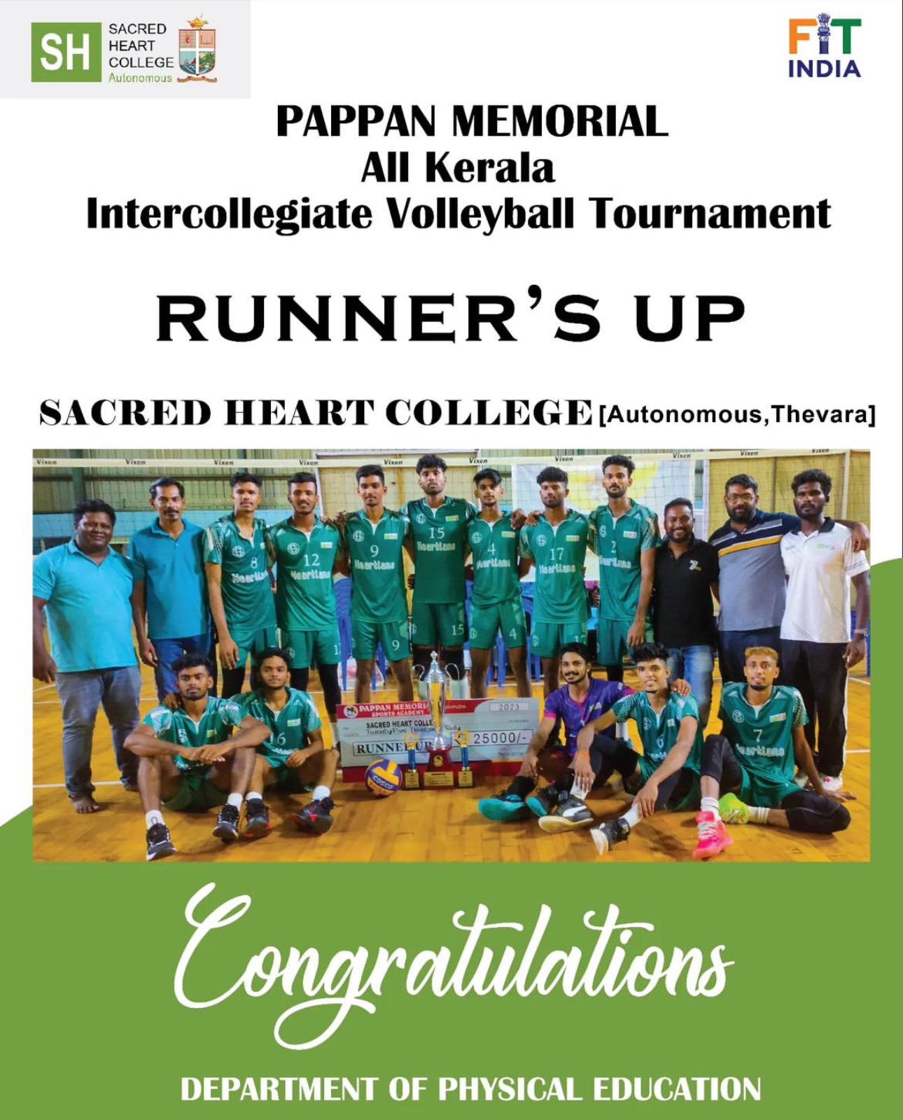 PAPPAN MEMORIAL All Kerala Intercollegiate Volleyball Tournament RUNNER'S UP SACRED HEART COLLEGE [Autonomous, Thevara] Congratulations DEPARTMENT OF PHYSICAL EDUCATION