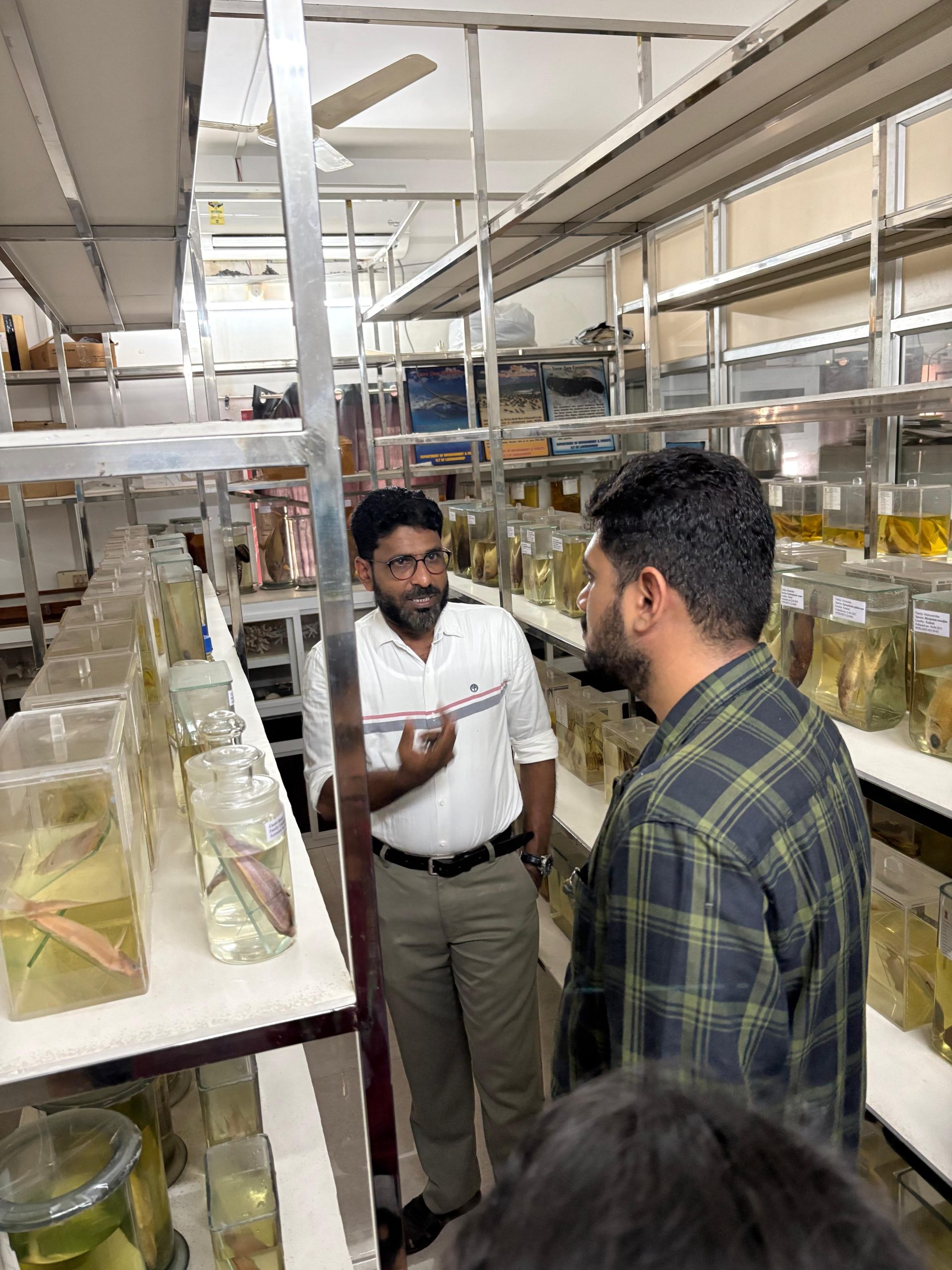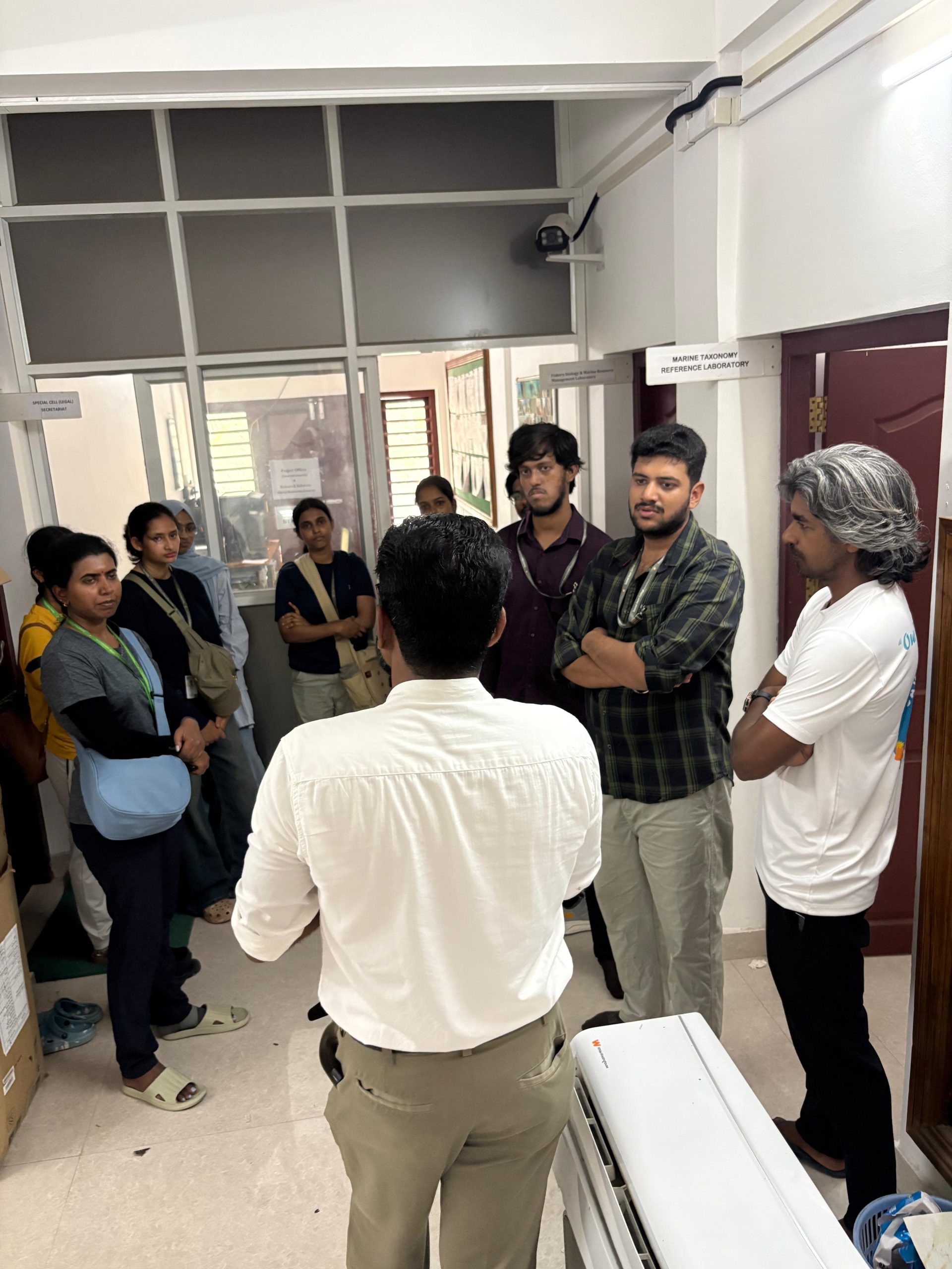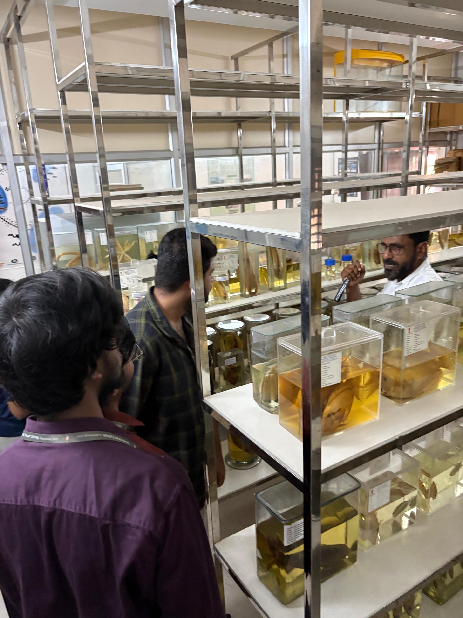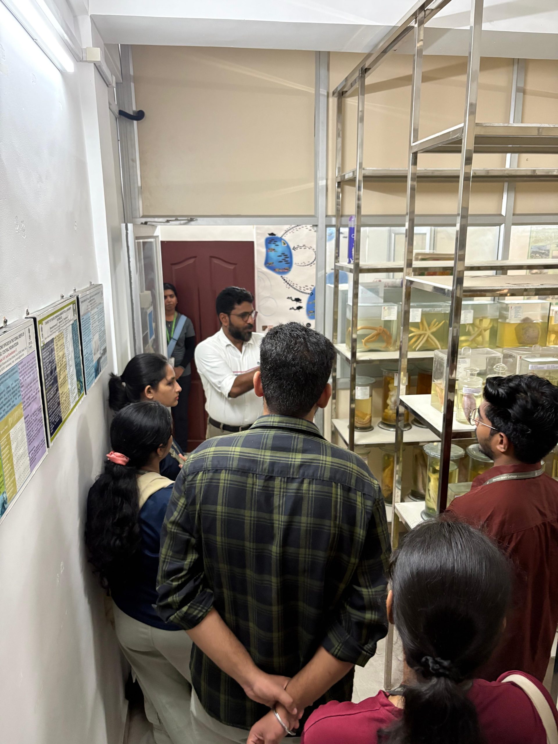 As part of the SEM II Marine Ecosystem Field Study (2025–2026), students of the Department of Environmental Studies undertook an academic field visit to the Department of Science & Technology, Kavaratti, under the Administration of Lakshadweep, Government of India. The students had an interactive session with Dr. Idress Babu, Scientist at the Department of Science & Technology, U.T. of Lakshadweep, who provided valuable insights into ongoing scientific research, marine biodiversity conservation initiatives, and climate-related challenges faced by island ecosystems. During the visit, students were given access to the laboratory facilities, where preserved marine specimens including corals, shells, and other reef-associated organisms were displayed and explained in detail. The exposure helped students understand species identification, coral morphology, reef ecology, and the importance of scientific documentation in marine conservation. The interaction bridged classroom learning with real-world scientific practice and offered students an opportunity to engage directly with experts working in island-based environmental management.