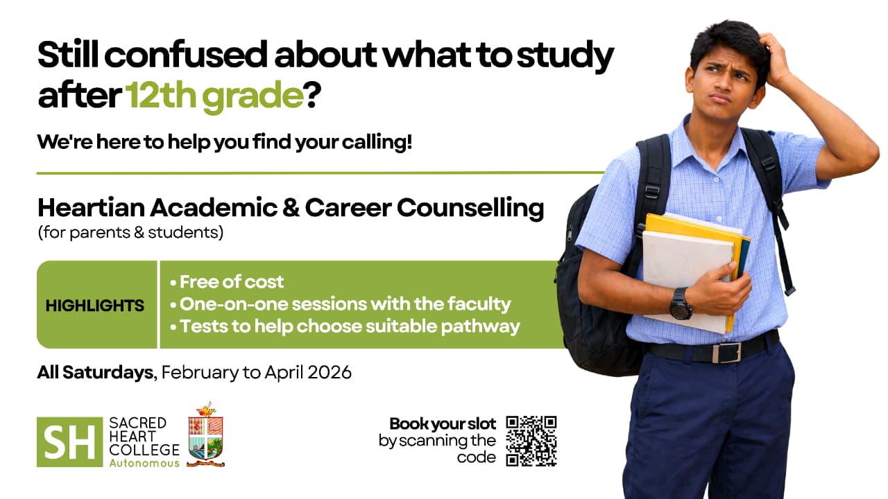 Still confused about what to study after 12th grade? We're here to help you find your calling! Book your slot Now : Click Here Heartian Academic & Career Counselling (for parents & students) കൊച്ചി: തേവര സേക്രഡ് ഹാർട്ട് കോളേജിൽ 2026-27 അദ്ധ്യയന വർഷത്തെ പ്രവേശനത്തിന് മുന്നോടിയായി പ്ലസ് ടു കുട്ടികൾക്കും മാതാപിതാക്കൾക്കും "ഹാർട്ടിയൻ അക്കാദമിക്/കരിയർ കൗൺസലിങ്"…
