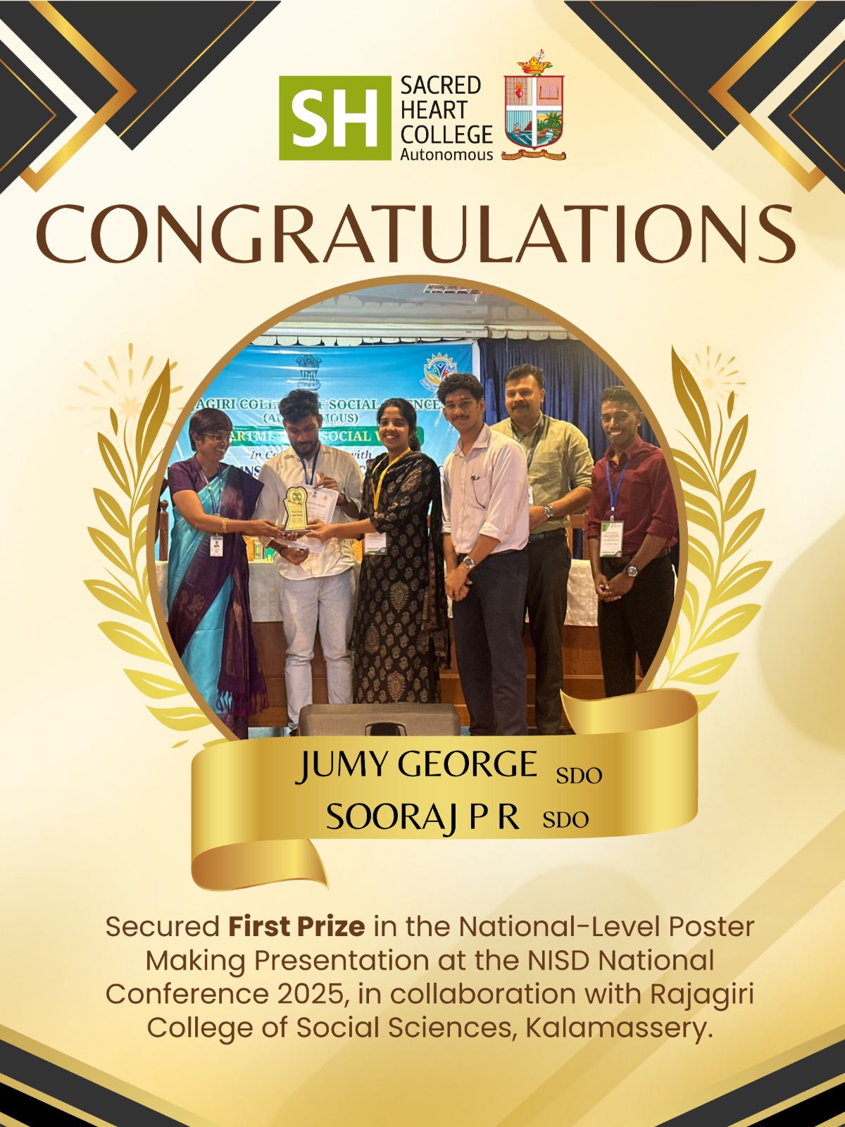 HEARTY CONGRATULATIONS MR.SOORAJ PR & MS.JUMY GEORGE STUDENT DEVELOPMENT OFFICERS For securing first prize in Poster presentation titles" Empowering Senior Citizens through Intergenerational Learning: A Case Study of Age Friendly Programs of Sacred Heart College " on National Conference "A New Era For Elderly India" jointly conducted by Rajagiri College…