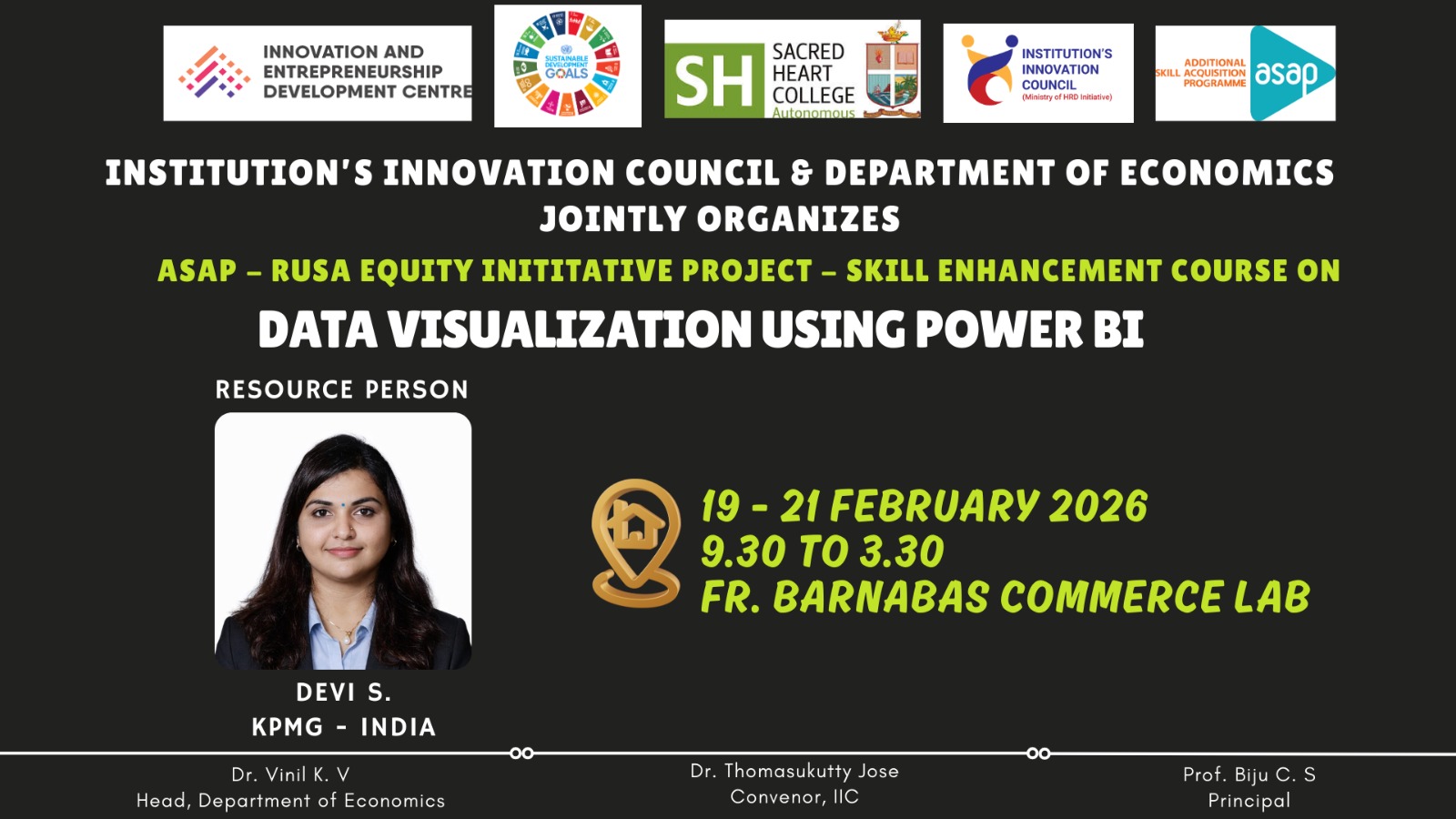 The Insitution's Innovation Council and the Department of Economics jointly organises an ASAP-RUSA Equity Initiative Project- Skill Enhancement Course on "Data Visualisation Using Power BI" from 19-21 February 2026 at Fr. Barnabas Commerce lab.