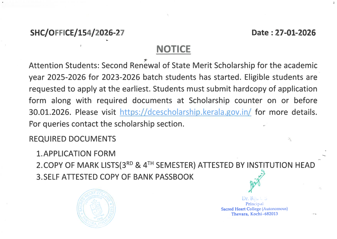 Attention Students: Second Renewal of State Merit Scholarship for the academic year 2025-2026 for 2023-2026 batch students has started. Eligible students are requested to apply at the earliest. Students must submit hardcopy of application form along with required documents at Scholarship counter on or before 30.01.2026. Please visit https://dcescholarship.kerala.gov.in/ for…