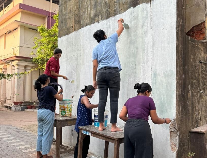 As part of Kochi beautification project, in association with Kites foundation, Sacred heart college students participated in the wall painting activities at GGHSS, Kochi. In the first phase, the corporation has identified 10 locations in the city. “Ernakulam South and North bridges, Willingdon Island, and Marine Drive are some of the locations identified. The core objective of this is cleaning the littered spots, and creating wall paintings to deter people from dirtying the place again. These paintings include elements that represent Kochi city.